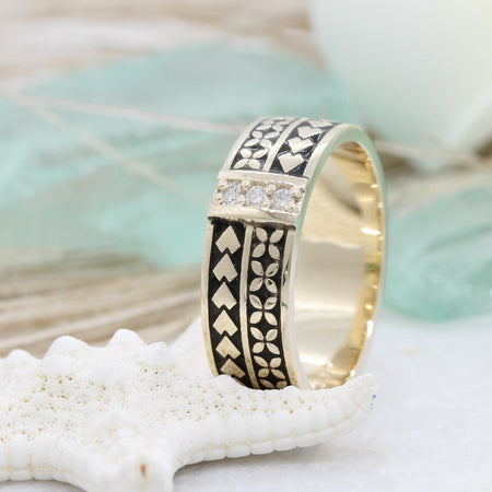 {"id":4718936162382,"title":"NC042L - Ladies Diamond Spear and Flower Bar Ring","handle":"diamond-spear-and-flower-bar-ring-nc042l","description":"\u003cp\u003eA stunning and unique polynesian wedding ring, with spear and flower motifs is 5.5mm wide. This ladies ring is set with 3=0.06ct of diamonds, and can be easily resized later down the track. A correct finger size is needed measured only at a jeweller with a thin ring.\u003cbr\u003e\nIt also has a matching mens wedding ring as well see NC 042M.\u003cbr\u003e\nIt is also available in either white of yellow gold. It takes 4 weeks to make, and just 2 days to get to you if your in australia. If your international allow 2 weeks for shipping.\u003c\/p\u003e","published_at":"2020-05-28T21:17:06+10:00","created_at":"2020-05-28T21:17:06+10:00","vendor":"Nesian Creations","type":"Rings","tags":["polynesian wedding ring","Rings"],"price":110000,"price_min":110000,"price_max":110000,"available":true,"price_varies":false,"compare_at_price":null,"compare_at_price_min":0,"compare_at_price_max":0,"compare_at_price_varies":false,"variants":[{"id":32379302215758,"title":"Default Title","option1":"Default Title","option2":null,"option3":null,"sku":"NC042L","requires_shipping":true,"taxable":false,"featured_image":null,"available":true,"name":"NC042L - Ladies Diamond Spear and Flower Bar Ring","public_title":null,"options":["Default Title"],"price":110000,"weight":0,"compare_at_price":null,"inventory_management":null,"barcode":"","requires_selling_plan":false,"selling_plan_allocations":[]}],"images":["\/\/nesiancreations.com.au\/cdn\/shop\/products\/IMG_2293.jpg?v=1591441269"],"featured_image":"\/\/nesiancreations.com.au\/cdn\/shop\/products\/IMG_2293.jpg?v=1591441269","options":["Title"],"media":[{"alt":null,"id":7220238286926,"position":1,"preview_image":{"aspect_ratio":1.0,"height":1394,"width":1394,"src":"\/\/nesiancreations.com.au\/cdn\/shop\/products\/IMG_2293.jpg?v=1591441269"},"aspect_ratio":1.0,"height":1394,"media_type":"image","src":"\/\/nesiancreations.com.au\/cdn\/shop\/products\/IMG_2293.jpg?v=1591441269","width":1394}],"requires_selling_plan":false,"selling_plan_groups":[],"content":"\u003cp\u003eA stunning and unique polynesian wedding ring, with spear and flower motifs is 5.5mm wide. This ladies ring is set with 3=0.06ct of diamonds, and can be easily resized later down the track. A correct finger size is needed measured only at a jeweller with a thin ring.\u003cbr\u003e\nIt also has a matching mens wedding ring as well see NC 042M.\u003cbr\u003e\nIt is also available in either white of yellow gold. It takes 4 weeks to make, and just 2 days to get to you if your in australia. If your international allow 2 weeks for shipping.\u003c\/p\u003e"}