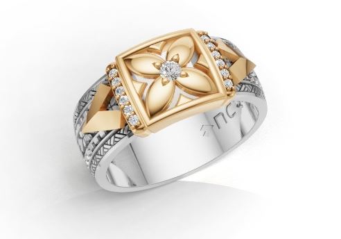 This ring has an 8.5mm wide band and at its widest point, is just under 10mm wide. The band is made from 925 Silver and the top features the contrast of 9ct yellow gold set with high grade Lab grown diamonds. This ring also has a matching mens band - NC5165